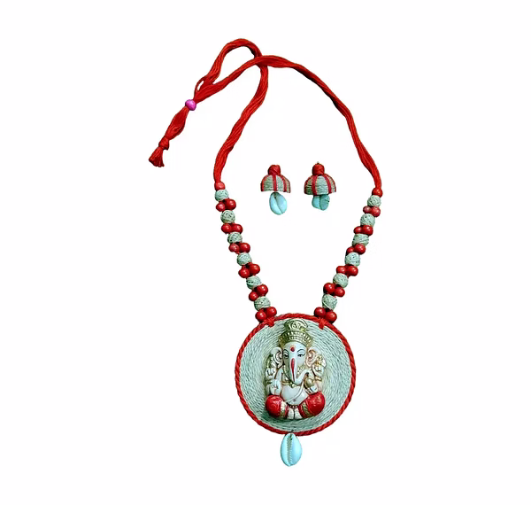 Celebrate divine craftsmanship with this Handcrafted Ganesha Pendant Jewelry Set, made from natural banana fibre by skilled artisans in Uttar Pradesh, India. The centerpiece features a beautifully detailed Ganesha motif, symbolizing prosperity and protection, set within a circular pendant that highlights the earthy charm of banana fibre.