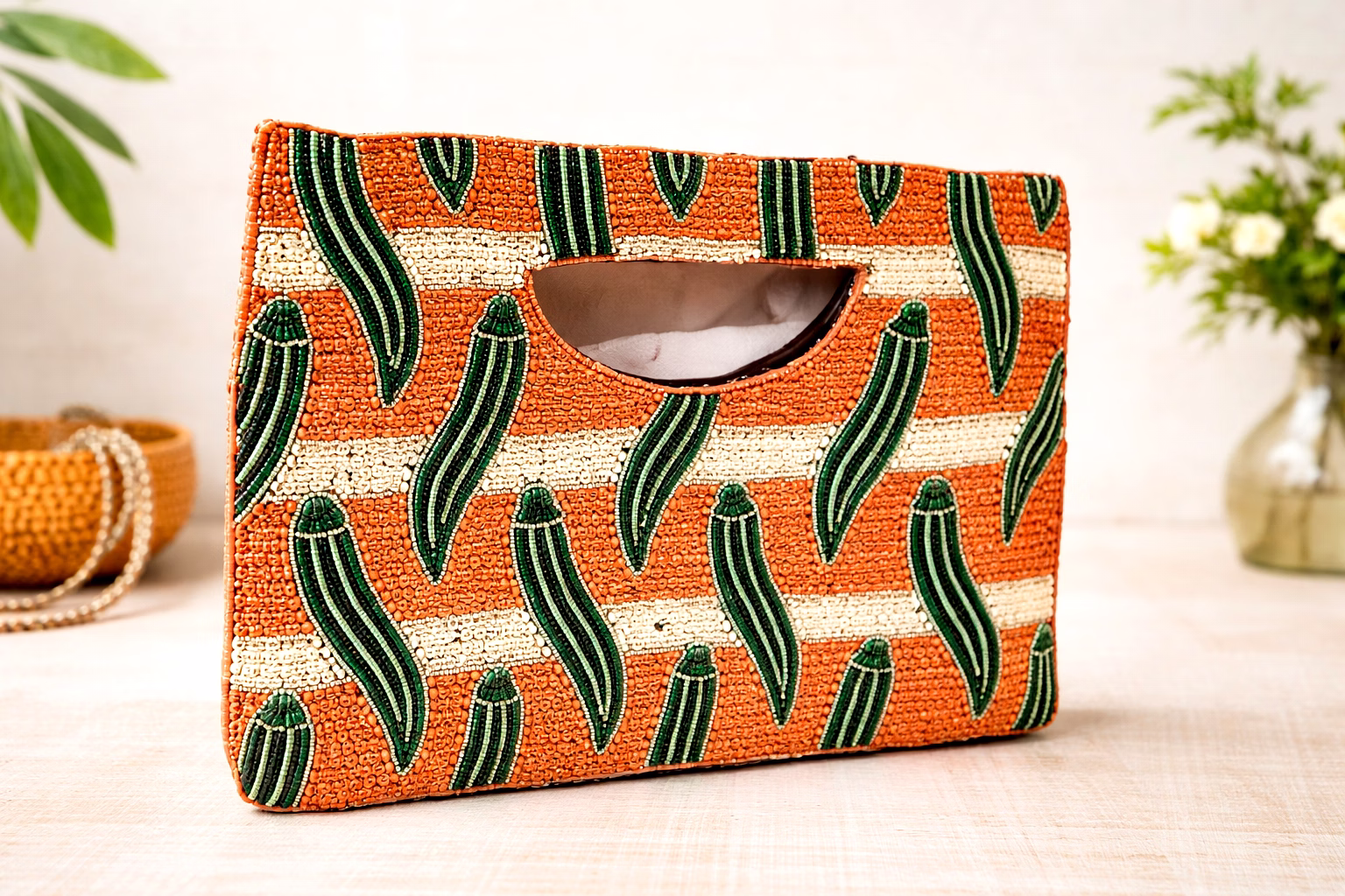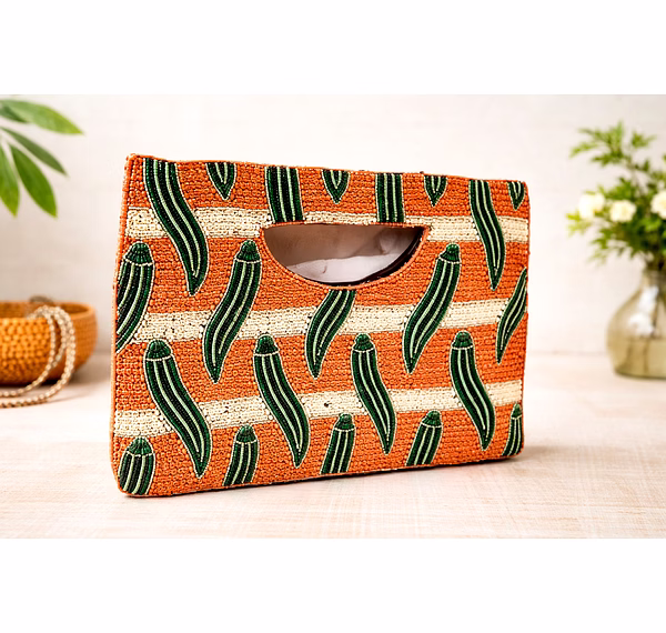 Step into the spotlight with our exclusive Handcrafted Green Chili Beaded Clutch Bag that adds a touch of tropical glam to your ensemble. The intricate beadwork and cut-out handle showcase exceptional artistry for a standout accessory.