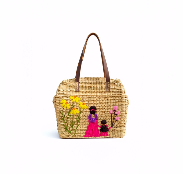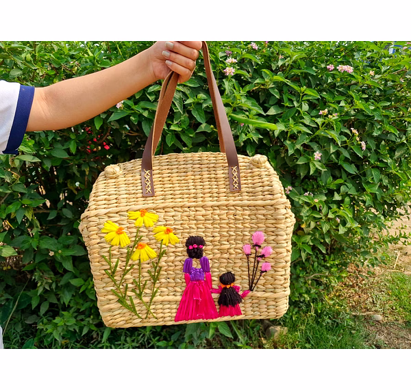 Featuring an intricate hand-embroidered design of a mother and child amid blooming flowers, this piece beautifully captures themes of love, nature, and craftsmanship. The sturdy handles add durability and style, making it perfect for everyday use, travel, or gifting. Each bag reflects ethical production and supports local artisan livelihoods.
