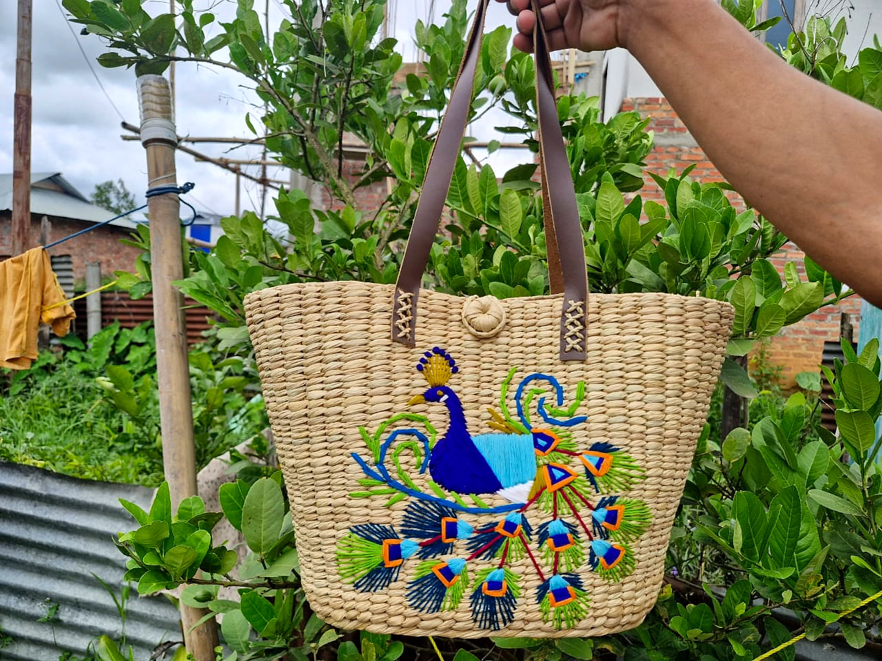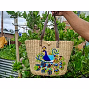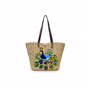 The highlight of this piece is its vibrant hand-embroidered peacock motif, symbolizing grace and beauty. With sturdy leather handles, a secure closure, and a smooth woven finish, this bag is as functional as it is artistic — ideal for everyday use, travel, or gifting.
