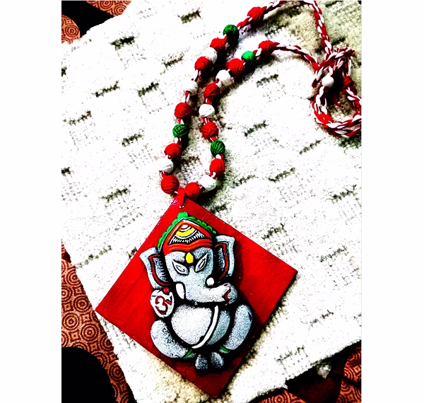 The necklace showcases a beautifully molded Ganesha figure in soft grey tones against a striking red square base, symbolizing strength, wisdom, and prosperity. The hand-rolled clay beads in red, green, and white add vibrancy and texture, while the adjustable braided thread ensures comfort and versatility.