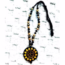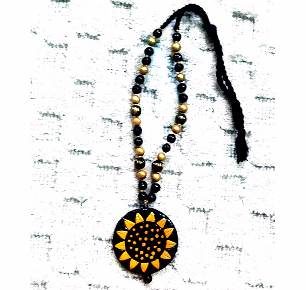 Radiating the warmth of traditional Indian artistry, this terracotta sunflower necklace is beautifully handmade by skilled artisans in Uttar Pradesh. The striking sun-inspired pendant in yellow and black tones symbolizes positivity and elegance, while the handcrafted terracotta beads complete its natural charm.
