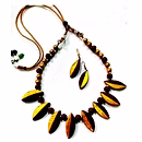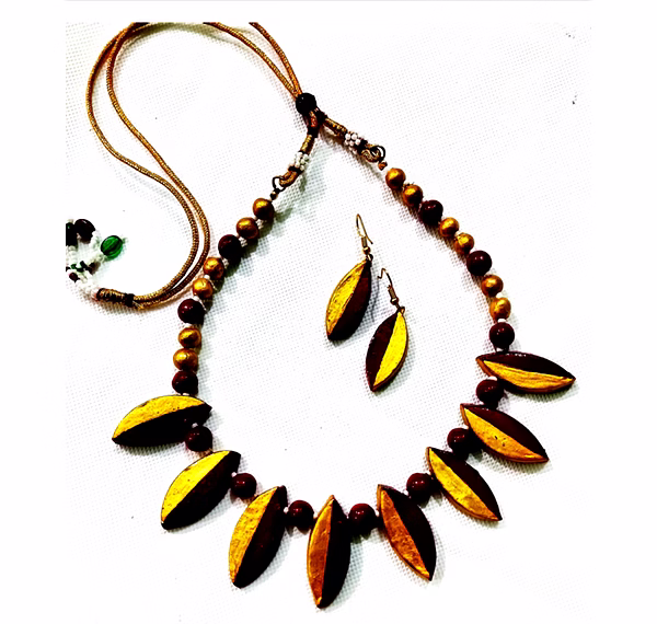 This elegant handcrafted terracotta jewelry set from Uttar Pradesh embodies the rich legacy of Indian artistry. Featuring sleek leaf-shaped pendants in earthy shades of gold and brown, this necklace set beautifully merges nature-inspired design with traditional craftsmanship.