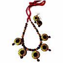 Celebrate the elegance of Indian craftsmanship with this handcrafted terracotta jewelry set from Uttar Pradesh, India. This stunning necklace features sunburst-inspired circular pendants in radiant gold, black and maroon tones, paired with matching earrings that exude earthy sophistication.