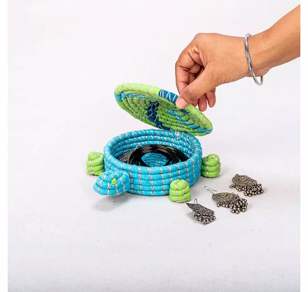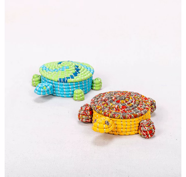 Add a splash of whimsy and artisan charm to your storage solutions with this handwoven turtle-shaped box. Crafted from colorful, coiled rope and meticulously stitched into a turtle silhouette, each box showcases unique craftsmanship and personality.