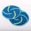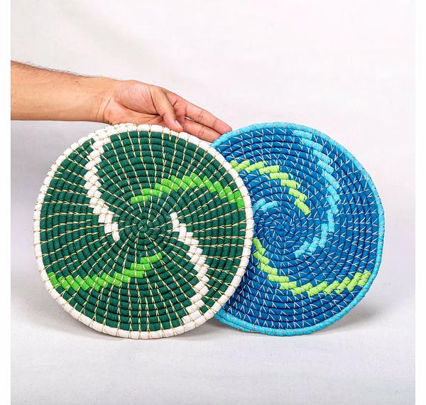 Add a vibrant and sustainable touch to your dining space with these handwoven spiral placemats. Crafted by skilled artisans using upcycled fabric and natural cotton cords, these round mats feature bold swirl patterns in lively shades of blue, green, and white—bringing both functionality and artful design to the table.
