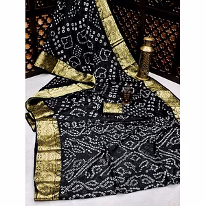 This Heavy Bandhej Saree is a showstopper that will make you the center of attention at any event! With stunning work and a rich border, this saree is perfect for every occasion. The intricately woven bandhej pattern adds an element of elegance, while the heavy work on the pallu and border add a touch of glamour. Crafted from high-quality fabric, this saree is not only beautiful but also comfortable to wear. The soft and lightweight material drapes effortlessly, making you feel confident and stylish all day long. The rich and vibrant colors of the saree make it perfect for any occasion, whether it's a formal event or a casual get-together. The versatility of this saree is unmatched, making it a valuable addition to any wardrobe. The unique selling point of this Heavy Bandhej Saree is its ability to create a bold and beautiful statement without being over-the-top. It strikes the perfect balance between being traditional and modern, making it a must-have for any fashion-forward woman. Overall, this saree is a perfect combination of style, comfort, and elegance. It is a true investment piece that will never go out of style and will be a cherished addition to your wardrobe for years to come. So, if you want to stand out from the crowd and make a statement, this Heavy Bandhej Saree is the perfect choice!