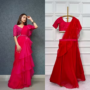 Introducing our stunning Lehenga Saree, crafted with utmost precision to bring out your inner diva. Made with high-quality Heavy Georgette fabric, this masterpiece is designed to make you stand out from the crowd. The Lehenga Saree features a 4-meter flair, giving you a mesmerizing and elegant silhouette. With a waist size of 42 inches, it ensures a comfortable and flattering fit for all body types. The Pallu length is 2.5 meters, gracefully attached to the lehenga, adding a touch of grace and sophistication to your overall look. The blouse, made with exquisite Banglory fabric, boasts front embroidery work that adds a regal charm to the ensemble. With a full stitch option available up to 42 inches, it guarantees a perfect fit and effortless style. What sets our Lehenga Saree apart is its unique combination of traditional and contemporary elements. The heavy Georgette fabric gives it a luxurious feel, while the intricate embroidery work adds a modern twist. Whether you're attending a wedding, festive celebration, or any special occasion, this Lehenga Saree is the epitome of elegance and glamour. Designed for the modern woman who appreciates timeless beauty, this Lehenga Saree is a must-have addition to your wardrobe. Its versatility allows you to effortlessly transition from day to night, making it a perfect choice for any event. Experience the allure and charm of our Lehenga Saree, designed to make you feel like royalty. Embrace your inner fashionista and make a lasting impression with this exquisite ensemble. Shop now and elevate your style to new heights with our Lehenga Saree.