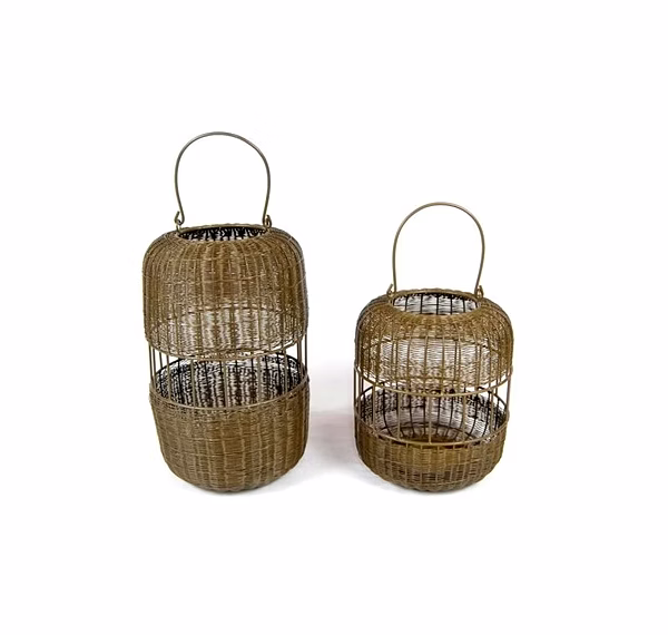These hurricane lanterns come in two sizes: 9x9x15 inches and 9x9x11 inches. They are made of iron and have weights of 2.050 kg and 1.385 kg, respectively.