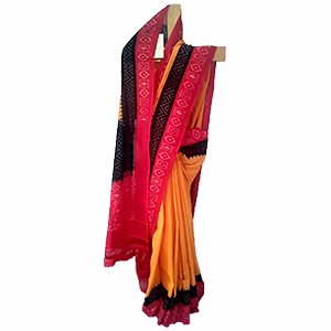 Yellow body with black and red borders with blouse Material (Warp/Weft): Cotton 120/100 count Size: (In m) 6.4 m