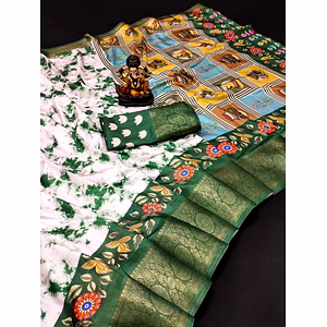 This stunning Indian Flag Print Dola Silk Saree with Contrast Border is the perfect blend of traditional and modern styles. Made with high-quality Dola silk, this saree is soft, lightweight, and comfortable to wear. The saree features a beautiful Indian flag print that represents unity in diversity, making it a great choice for Independence Day and Republic Day celebrations. The contrasting border in vibrant colors adds a touch of elegance and makes the saree stand out. Designed to flatter all body types, this saree comes with an unstitched blouse piece that can be customized to your liking. The saree drapes beautifully and is perfect for any occasion, be it a wedding, festival, or formal event. The unique selling point of this saree lies in its versatility. It can be dressed up or down, and can be styled in different ways to suit your mood and personality. Wear it with traditional Indian jewelry and accessories for a classic look, or team it up with modern accessories for a trendy vibe. Overall, the Indian Flag Print Dola Silk Saree with Contrast Border is a must-have in every Indian woman's wardrobe. With its unique blend of style, comfort, and versatility, it offers unmatched value and is sure to make you stand out from the crowd. Upgrade your wardrobe today with this beautiful saree and experience the magic of Indian fashion!