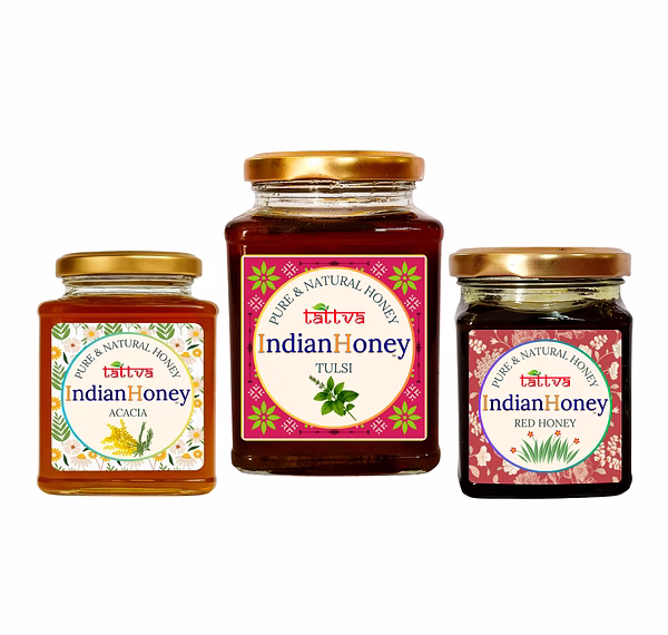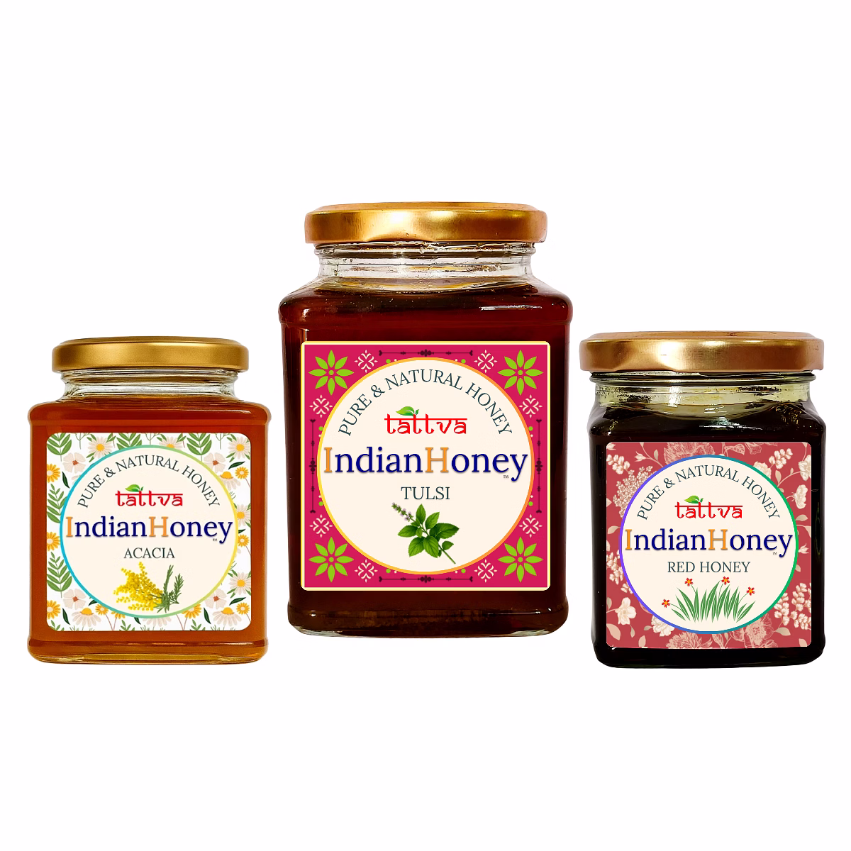 IndianHoney's Ultimate Wellness Trio: Experience the power of three distinct and therapeutic honeys. This pack features our powerful Ayurvedic Tulsi (Holy Basil) Infused Honey. Known as the 'Queen of Herbs' for its adaptogenic and expectorant properties, supporting stress relief and respiratory health., rare, highpotency Red Honey, prized for its exceptionally high concentration of hearthealthy flavonoids and antioxidants., and exceptionally lightcolored and lowGlycemic Index (GI) Rajasthan Acacia Honey. Known for its mild floral taste and superior digestibility.. Sourced raw and pure, this combo is designed for comprehensive health, including boosted immunity, respiratory support, and daily vitality. (Includes 1x500gm + 2x230gm jars).