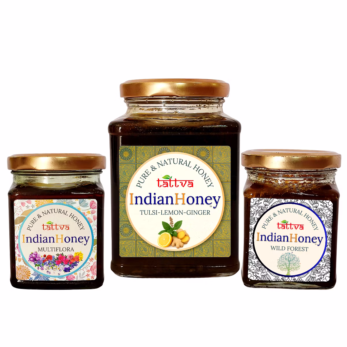 IndianHoney's Ultimate Wellness Trio: Experience the power of three distinct and therapeutic honeys. This pack features our powerful Ayurvedic Tulsi (Holy Basil) Infused Honey. Known as the 'Queen of Herbs' for its adaptogenic and expectorant properties, supporting stress relief and respiratory health., deep, earthy and nutrientdense Wild Forest Honey, sourced from diverse deepforest flora. A potent superfood known for its antiinflammatory properties., and delicate, floral notes of Himalayan Multiflora. A natural immunity booster, rich in vitamins and minerals.. Sourced raw and pure, this combo is designed for comprehensive health, including boosted immunity, respiratory support, and daily vitality. (Includes 1x500gm + 2x230gm jars).