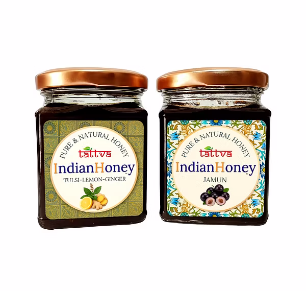 IndianHoney Diabetics-Friendly Jamun Honey & Warming & Anti-Inflammatory Ginger Infused Honey Combo Pack (230gm & 230gm) - Jamun & Tulsi Lemon Ginger Details
