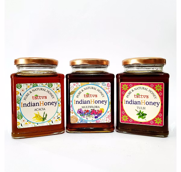 IndianHoney Himalayan Multiflora, tulsi, & Rajasthan Acacia Honey Triple Combo Pack (500*3) Himalayan Multiflora tulsi Rajasthan Acacia Honey collection (pack of 3)500*3 GM Details
