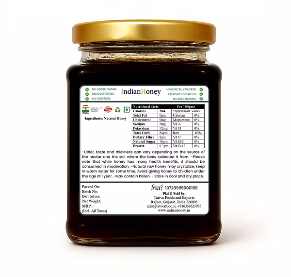 IndianHoney presents premium quality honey sourced ethically from trusted beekeepers across India. This pure and natural honey is unprocessed, unfiltered, and free from added sugar or preservatives. Rich in antioxidants, vitamins, and minerals, it serves as a natural sweetener perfect for your daily wellness routine. Use it in warm water, tea, desserts, or as a natural spread. Each 500g glass jar preserves the authentic flavor and nutritional richness of raw honey, ensuring you get the best nature has to offer in every spoonful.