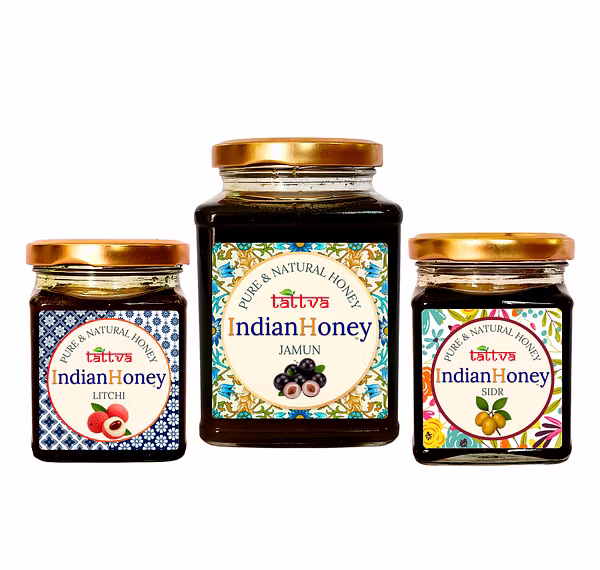 IndianHoney's Ultimate Wellness Trio: Experience the power of three distinct and therapeutic honeys. This pack features Jamun is a raw, natural delight., sidr is a raw, natural delight., and litchi is a raw, natural delight.. Sourced raw and pure, this combo is designed for comprehensive health, including boosted immunity, respiratory support, and daily vitality. (Includes 1x500gm + 2x230gm jars).