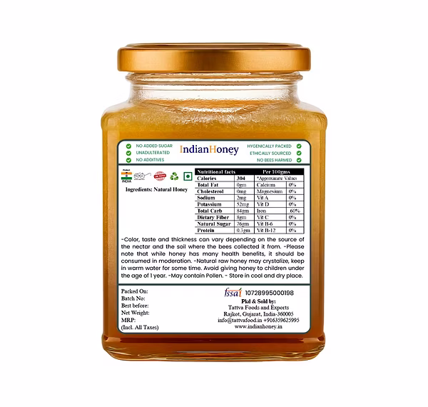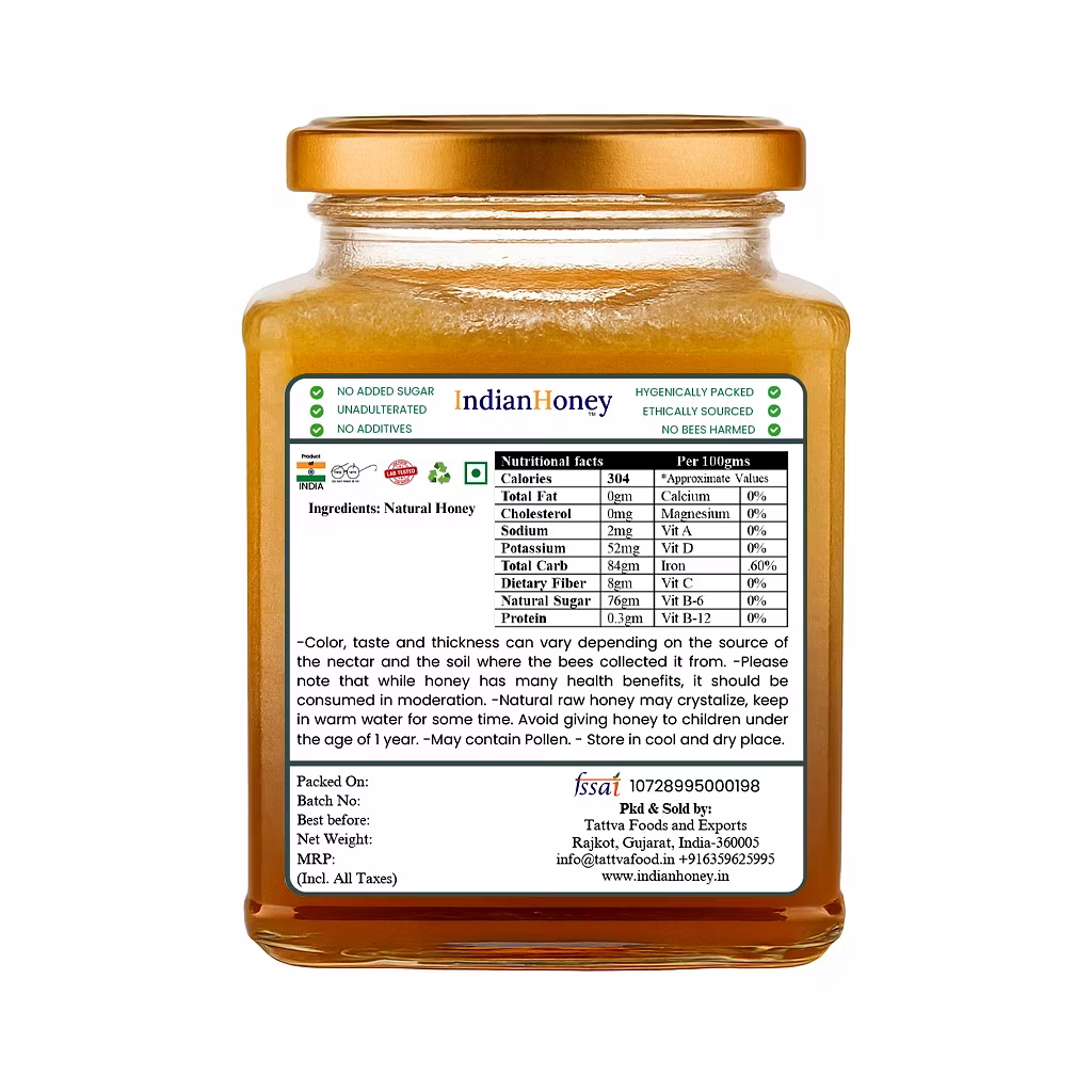 IndianHoney presents premium quality honey sourced ethically from trusted beekeepers across India. This pure and natural honey is unprocessed, unfiltered, and free from added sugar or preservatives. Rich in antioxidants, vitamins, and minerals, it serves as a natural sweetener perfect for your daily wellness routine. Use it in warm water, tea, desserts, or as a natural spread. Each 500g glass jar preserves the authentic flavor and nutritional richness of raw honey, ensuring you get the best nature has to offer in every spoonful.