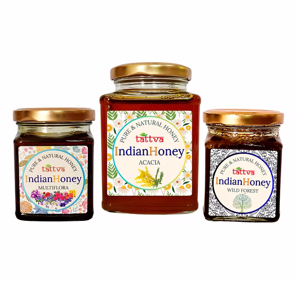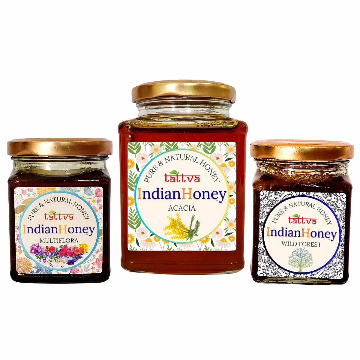 IndianHoney's Ultimate Wellness Trio: Experience the power of three distinct and therapeutic honeys. This pack features the exceptionally lightcolored and lowGlycemic Index (GI) Rajasthan Acacia Honey. Known for its mild floral taste and superior digestibility., deep, earthy and nutrientdense Wild Forest Honey, sourced from diverse deepforest flora. A potent superfood known for its antiinflammatory properties., and delicate, floral notes of Himalayan Multiflora. A natural immunity booster, rich in vitamins and minerals.. Sourced raw and pure, this combo is designed for comprehensive health, including boosted immunity, respiratory support, and daily vitality. (Includes 1x500gm + 2x230gm jars).