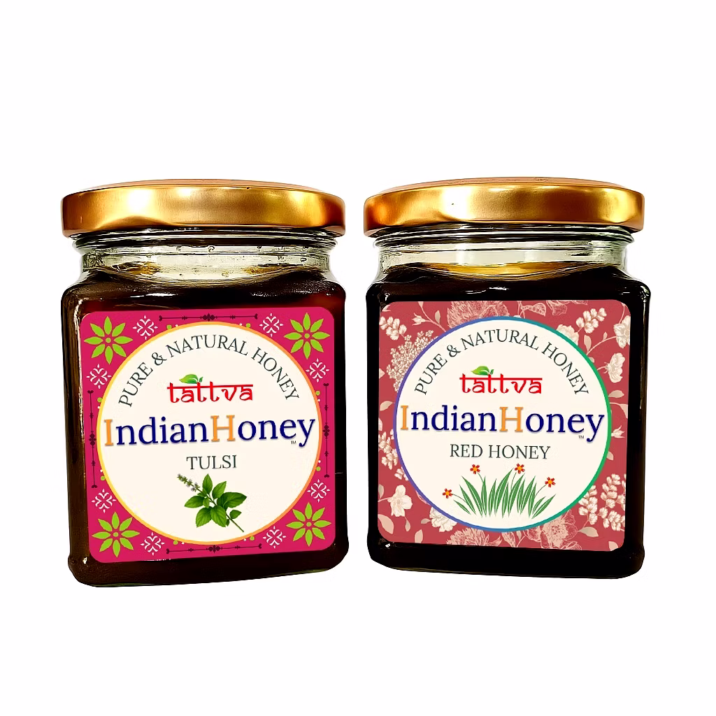 IndianHoney brings you the perfect health combination: the rare, high-potency Red Honey, prized for its exceptionally high concentration of heart-healthy flavonoids and antioxidants. and our powerful Ayurvedic Tulsi (Holy Basil) Infused Honey. Known as the 'Queen of Herbs' for its adaptogenic and expectorant properties, supporting stress relief and respiratory health. Sourced raw and pure, this duo offers complementary health benefits for your daily wellness. Ideal for use as a natural sweetener, immunity booster, or therapeutic tonic.