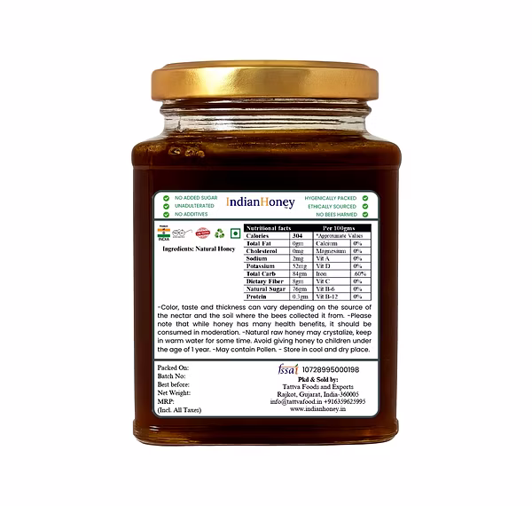 IndianHoney presents premium quality honey sourced ethically from trusted beekeepers across India. This pure and natural honey is unprocessed, unfiltered, and free from added sugar or preservatives. Rich in antioxidants, vitamins, and minerals, it serves as a natural sweetener perfect for your daily wellness routine. Use it in warm water, tea, desserts, or as a natural spread. Each 500g glass jar preserves the authentic flavor and nutritional richness of raw honey, ensuring you get the best nature has to offer in every spoonful.