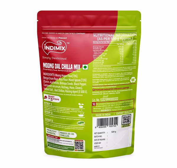 Ideal for importers, wholesalers, and distributors seeking reliable supply of indimix moong dal chilla - 500gm from trusted sources.