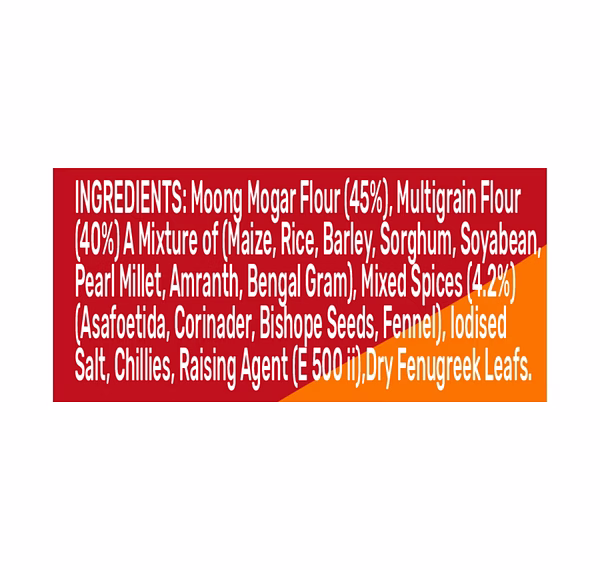 While the specific ingredient list is not detailed in the available sources, multigrain bhajiya mixes typically include a combination of flours from various grains such as chickpea (besan), rice, wheat, and millets, along with spices and seasoning.