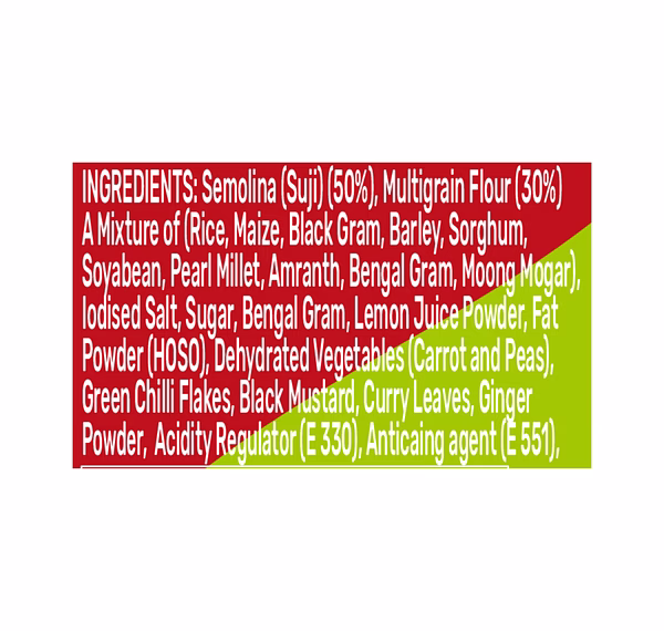 While the specific ingredient list is not provided in the available sources, multigrain upma mixes typically include a combination of semolina (rava), various milled grains, lentils, spices, and seasoning.