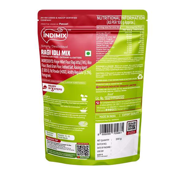 Indimix Ragi Idli Mix is a convenient and nutritious ready-to-cook product that allows you to prepare traditional South Indian idlis enriched with the health benefits of ragi (finger millet). Packaged in a 200-gram pouch, this mix is ideal for those seeking a quick and wholesome meal option. Key Features: Nutritious Ingredients: The mix is composed of 100% natural ingredients, including finger millet flour (ragi atta), rice flour, and black gram flour, providing essential micronutrients and dietary fibers.