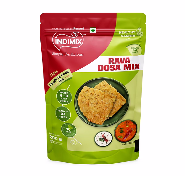 Indimix Rava Dosa Mix is a ready-to-cook blend designed to help you prepare authentic South Indian rava dosas effortlessly. Packaged in a 200-gram pouch, this mix allows you to enjoy crispy and flavorful dosas with minimal preparation. Key Features: Authentic Taste: Crafted to deliver the traditional flavor of South Indian rava dosas, this mix brings the rich taste of homemade dosas to your kitchen. High-Quality Ingredients: Made with 100% natural ingredients, including suji (semolina), gram flour, black gram flour, sesame seeds, and cumin, ensuring a nutritious and flavorful meal