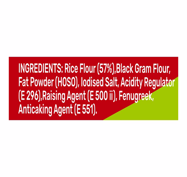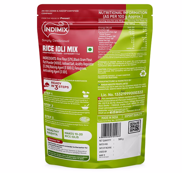 Indimix Rice Idli Mix is a ready-to-cook blend that simplifies the preparation of traditional South Indian idlis, offering a convenient and authentic breakfast option. This 500-gram pack ensures you can enjoy soft, fluffy idlis with minimal effort. Key Features: Authentic Taste: Crafted to replicate the traditional flavor of South Indian idlis, this mix brings the rich taste of homemade idlis to your kitchen. High-Quality Ingredients: The mix includes rice flour (60%), black gram flour, edible vegetable oil (refined sunflower), raising agent (INS 500 (ii)), acidity regulator (INS 296), salt, and fenugreek, ensuring a nutritious and flavorful meal. Nutritional Value: Per 100 grams, the mix provides approximately 365.32 Kcal of energy, 8.5 grams of protein, 70.5 grams of carbohydrates, and 1.5 grams of total fat, making it a balanced option for your meals.