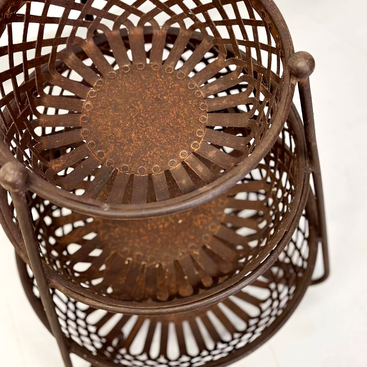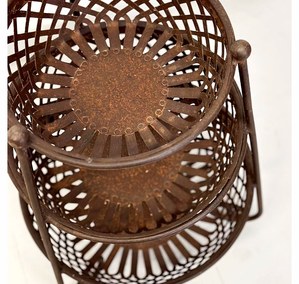Discover the convenience of the Iron 3 Basket Stand of 3 that combines vintage charm with practical organization. Keep your essentials neatly stored in its three distinct baskets, making it a versatile addition to any room.