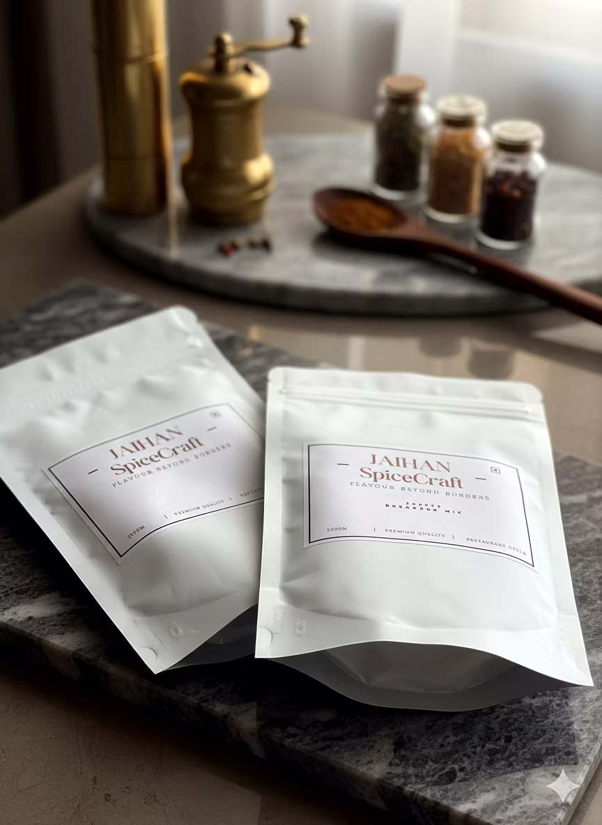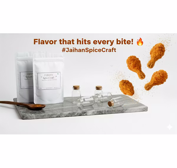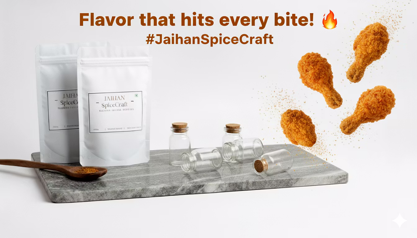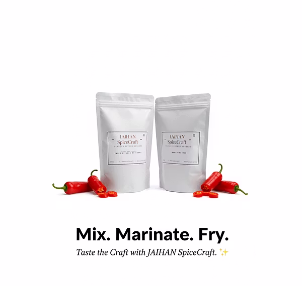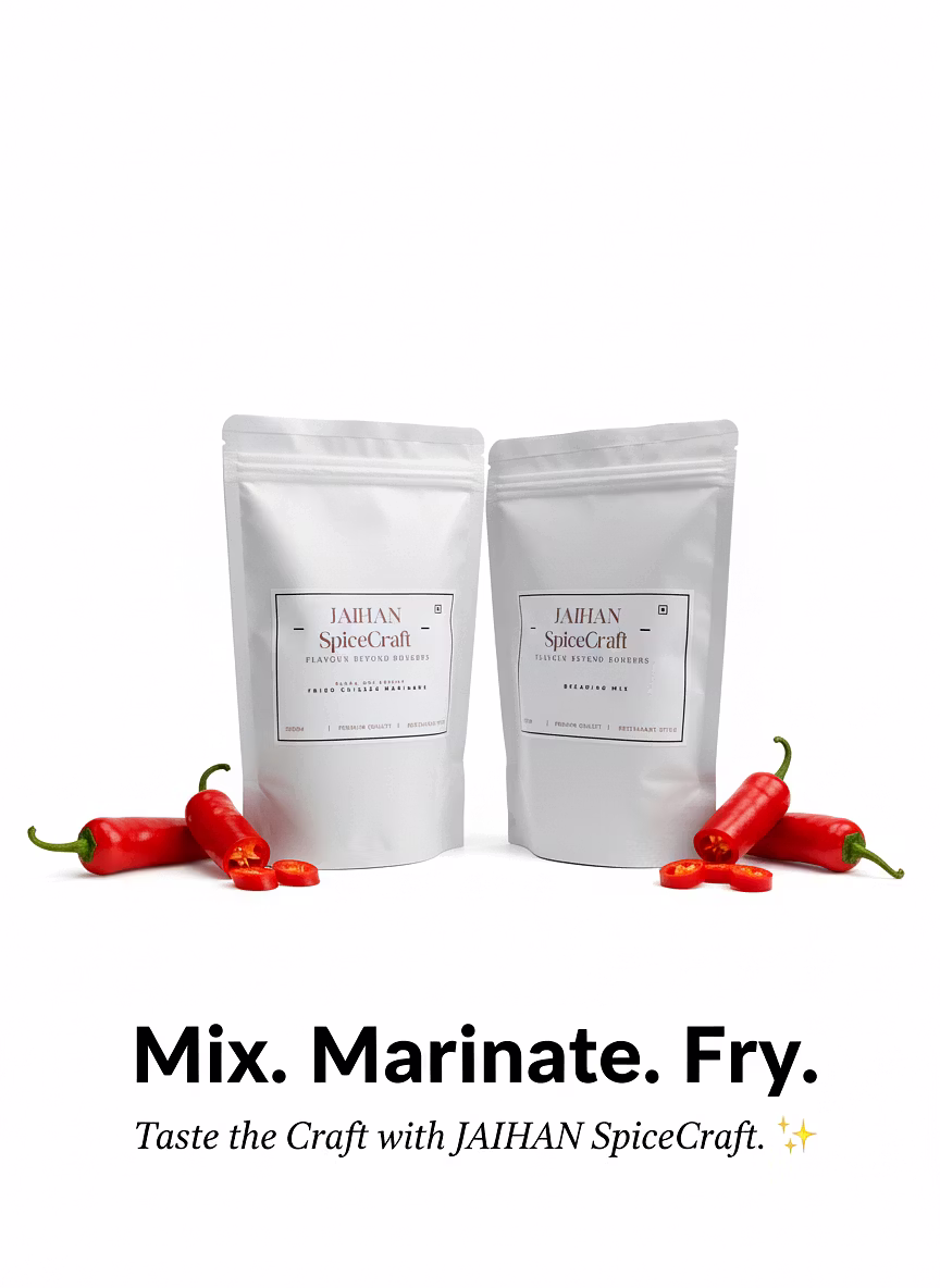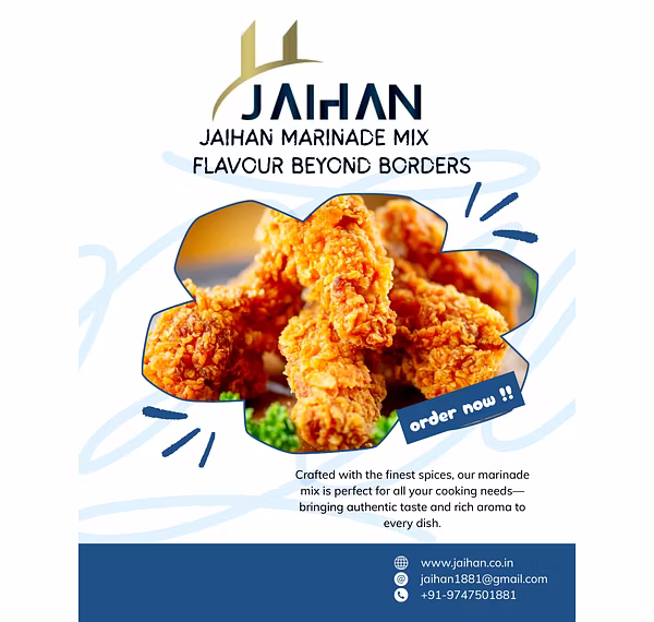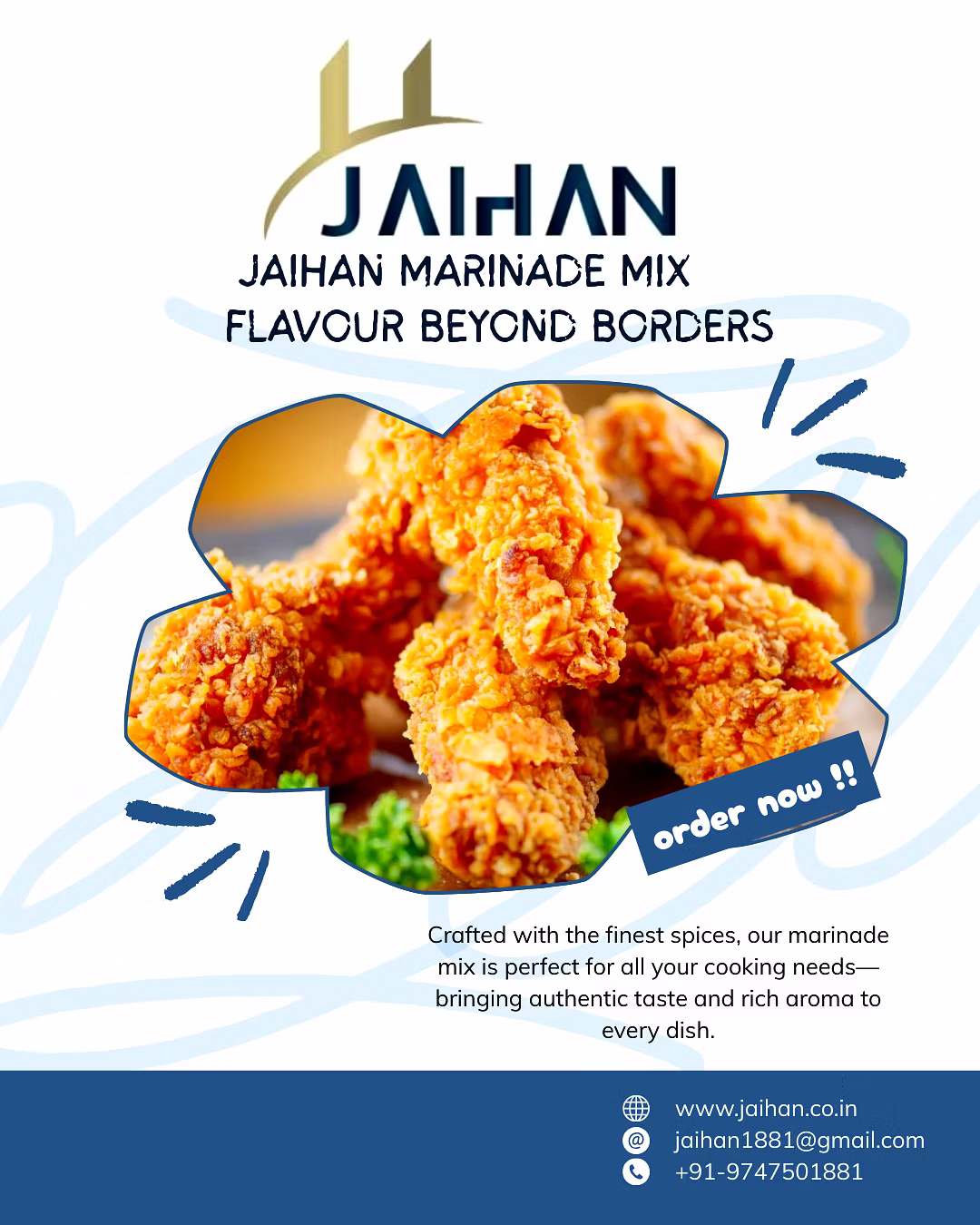 JAIHAN SpiceCraft offers a premium range of marinades and seasoning blends designed to bring restaurant-quality flavour to your kitchen or business. Our collection includes Fried Chicken, Extra Hot & Spicy, Hot Chilli, Spicy Fried Chicken, Alfaham, Spicy Alfaham, Grill Spicy, Peri Peri, Mexican Piri Piri, Barbeque, Tandoori Marinades, and our Breading Mix. Each product is crafted with authentic Indian spices to ensure consistent taste, juicy tenderness, and crispiness, perfect for home chefs, restaurants, catering services, and international buyers. Available in retail and bulk export-ready packs, JAIHAN SpiceCraft guarantees flavour beyond borders, making every dish unforgettable.