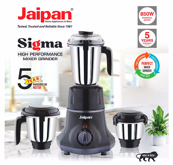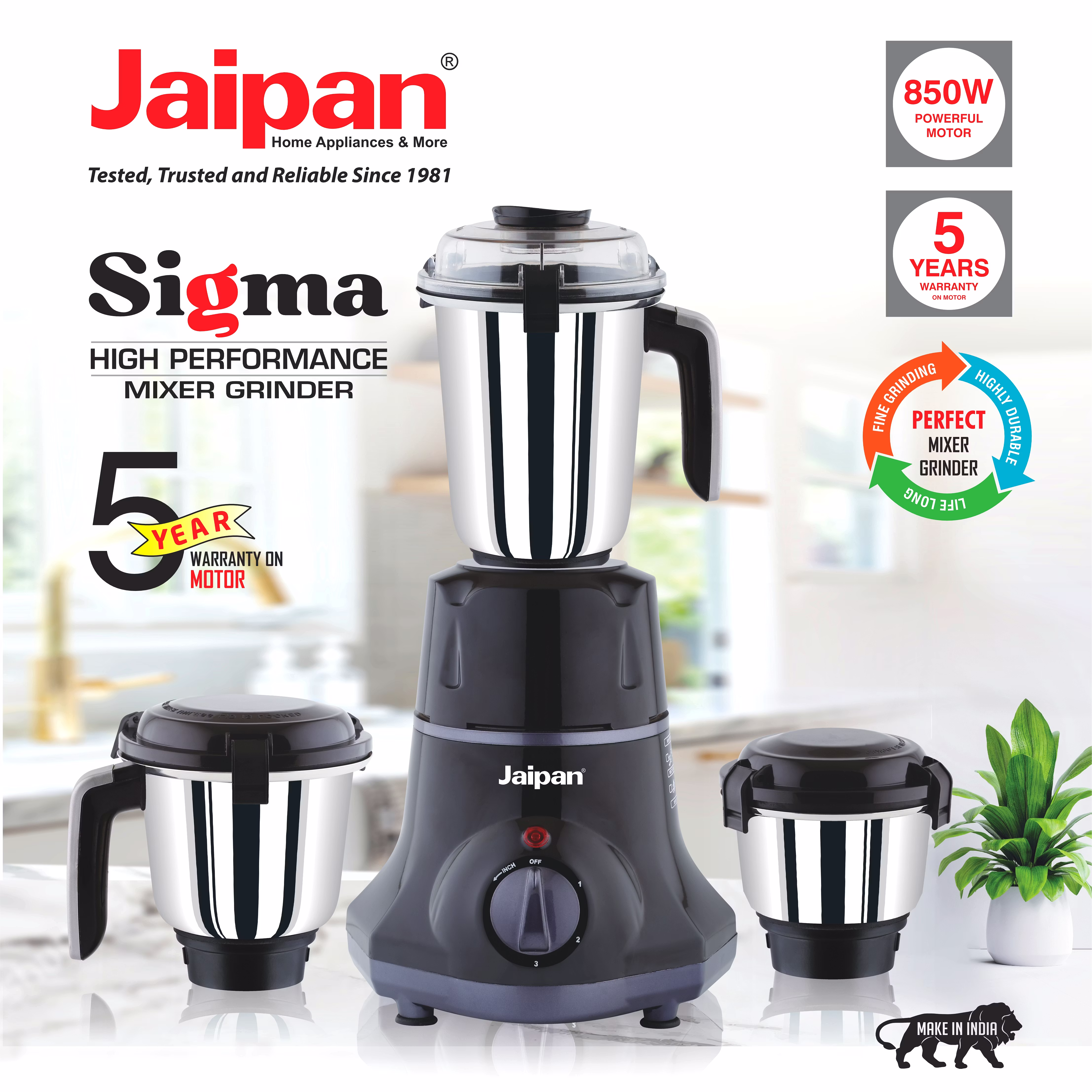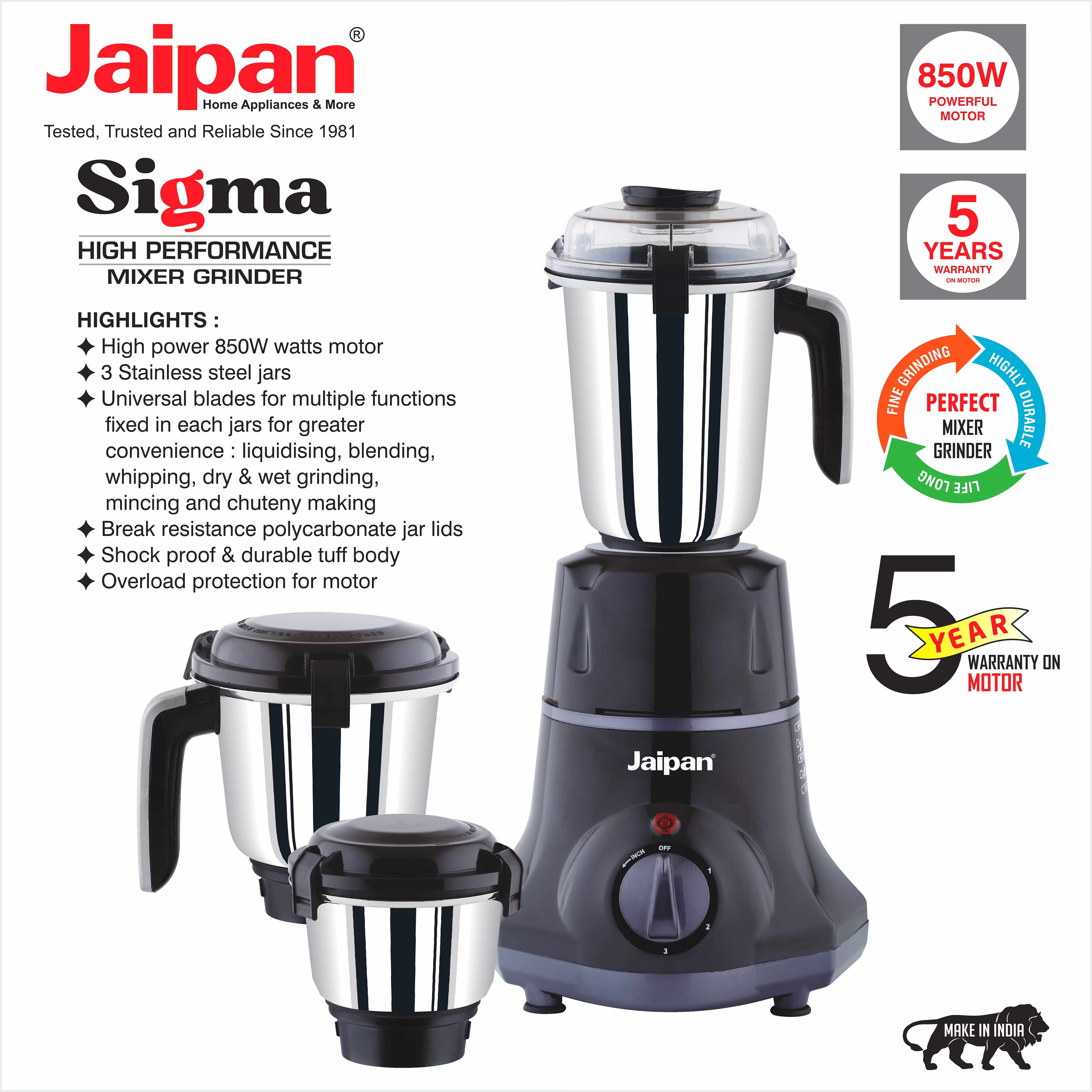 The Power-packed motor and it's uniquely crafted blades make grinding traditional masala, and more simple. The Jaipan Sigma mixer grinder's aesthetic design and the vibrant colours add a touch of style to your kitchen, while making cooking convenient. There's one for everyone. High Speed, Energy Efficient Motor, More Power, Lower Consumption of Electricity, Smooth Running, High Performance, Long life Mixer, Precision Engineered cutter-spindle assembly preloaded with oiled felt, Polycarbonate Lid, Unbreakable & Food Grade, An ISO 9001 :: 2000 Certified Company, The jars are made of stainless steel making them highly durable. It lets you do dry grinding as well as wet grinding in minutes.