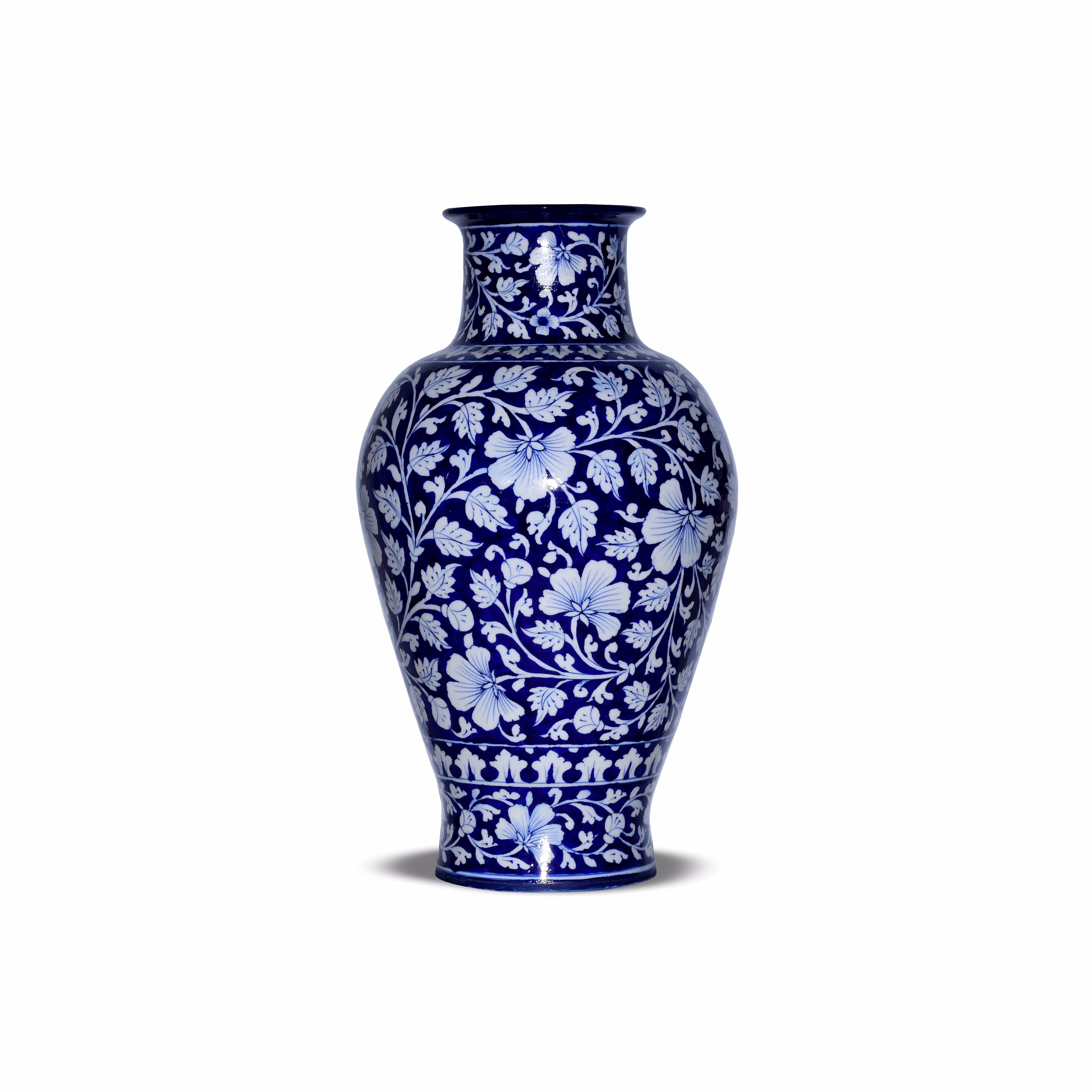 Celebrate the elegance of Indian craftsmanship with this Jaipur Blue Pottery Decorative Vase, a timeless expression of artistry from Rajasthan. Handcrafted by skilled artisans, this vase features intricate white floral motifs beautifully painted on a deep cobalt blue base, reflecting the centuries-old tradition of Jaipur’s renowned blue pottery.