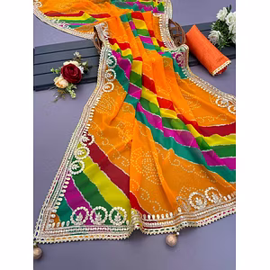 Introducing our stunning new saree made from soft Fox Gorgette fabric with Jaipruri Bhandani print and Jaipruri Gotta Patti work. This saree is perfect for those who desire a blend of traditional and modern fashion styles. The ribbon and C pallu design give it a unique look, while the new less border adds a touch of simplicity and elegance. Our saree is not only beautiful but also incredibly comfortable to wear. The soft and lightweight fabric drapes beautifully, making it easy to carry and perfect for any occasion. The saree also comes with a matching blouse made from high-quality Havi Mono Banglori fabric, which adds to its overall appeal. The blouse features Balaji less border, which complements the saree design perfectly. The saree's unique selling point is its Jaipruri Bhandani print and Jaipruri Gotta Patti work, which are traditional Rajasthani designs. These designs are handcrafted by skilled artisans using traditional techniques, adding a touch of elegance and luxury to the saree. The saree's vibrant colors and intricate design make it a perfect choice for weddings, parties, and other special occasions. In conclusion, our saree is a perfect blend of traditional and modern fashion styles, with a unique design that sets it apart from other sarees. Its soft and lightweight fabric, vibrant colors, and intricate design make it an ideal choice for any occasion. Get ready to turn heads and make a statement with our stunning new saree.