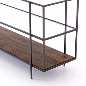 Uneven shelves play across slim and simple antique brass-finished iron framework. Clear glass brings a glamorous air to an industrial design aesthetic.