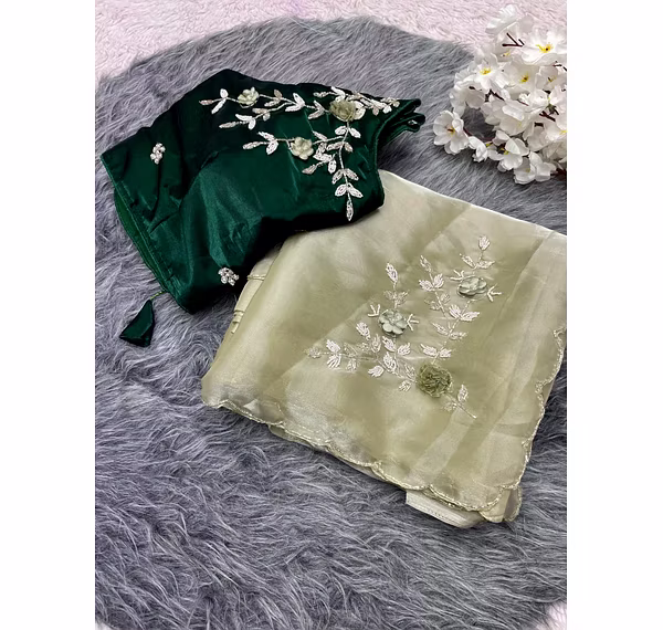 Introducing our exquisite Jimmy Choo satin fabric blouse with stunning khatli work. This beautifully crafted blouse is designed to elevate your style and make a bold fashion statement. Made with the highest quality Jimmy Choo satin fabric, this blouse exudes luxury and sophistication. Its smooth and lustrous texture will feel incredibly soft against your skin, ensuring maximum comfort throughout the day or evening. The standout feature of this blouse is the breathtaking khatli cut Dena handwork. Each intricate detail is meticulously crafted, showcasing the skill and artistry of our talented artisans. The khatli work adds a touch of elegance and uniqueness to the blouse, making it a truly one-of-a-kind piece. Not only is the khatli work exquisite, but it is also combined with an all-over arco bodar design. This combination creates a mesmerizing pattern that is both modern and timeless. The contrast of the delicate khatli work with the bold arco bodar adds depth and dimension to the blouse, ensuring it stands out from the crowd. Versatility is another key feature of this blouse. The stitch blouse design allows for easy customization and adjustment to fit your body perfectly. This ensures a flattering and comfortable fit, regardless of your body type. Whether you are attending a special event, a wedding, or a social gathering, this Jimmy Choo satin blouse is guaranteed to turn heads. Its unique design, premium fabric, and exquisite craftsmanship make it a must-have for any fashion-forward individual. Embrace luxury and elegance with this stunning blouse and make a statement wherever you go.