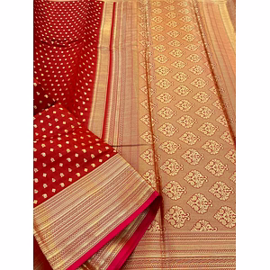 The Kanchipuram Pure Silk Handloom Saree with Gold and Silver Jari is a timeless piece of art that epitomizes the rich cultural heritage and traditional craftsmanship of Kanchipuram, a town renowned for its exquisite silk sarees. This saree is meticulously handwoven by skilled artisans, who dedicate countless hours to create a masterpiece that exudes elegance and grandeur. The saree is crafted from the finest quality pure silk, chosen for its lustrous texture and luxurious feel. The fabric drapes beautifully, enhancing the natural grace and poise of the wearer. It is soft to the touch yet durable, ensuring that it can be cherished and worn for many years to come. One of the most striking features of this saree is the intricate gold and silver jari work that adorns it. The jari, or metallic thread, is woven into elaborate patterns and motifs, often inspired by nature, mythology, and traditional Indian art. These patterns can include florals, paisleys, peacocks, and other symbolic designs, each carrying its own cultural significance. The combination of gold and silver jari lends a rich, opulent look to the saree, making it a perfect choice for grand occasions such as weddings, festivals, and other celebratory events. The body of the saree may feature a variety of patterns, from simple and understated to bold and elaborate, catering to diverse aesthetic preferences. The pallu, or the end piece of the saree, is often the highlight, showcasing the most intricate and detailed motifs, creating a stunning visual impact when draped over the shoulder. Accompanying this saree is a matching blouse piece woven from the same luxurious silk. The blouse can be tailored to fit, offering a personalized and comfortable fit that complements the saree perfectly. It often features matching jari work, ensuring a harmonious and cohesive look. In conclusion, the Kanchipuram Pure Silk Handloom Saree with Gold and Silver Jari is not just a garment, but a work of art that embodies the tradition, skill, and artistry of Indian textile craftsmanship. It is a treasured addition to any wardrobe, offering a timeless elegance that enhances the beauty and grace of the wearer.