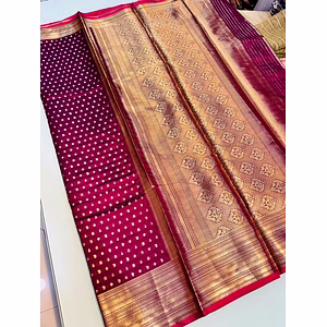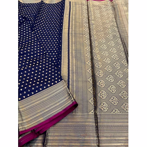 The Kanchipuram Pure Silk Handloom Saree with Gold and Silver Jari is a timeless piece of art that epitomizes the rich cultural heritage and traditional craftsmanship of Kanchipuram, a town renowned for its exquisite silk sarees. This saree is meticulously handwoven by skilled artisans, who dedicate countless hours to create a masterpiece that exudes elegance and grandeur. The saree is crafted from the finest quality pure silk, chosen for its lustrous texture and luxurious feel. The fabric drapes beautifully, enhancing the natural grace and poise of the wearer. It is soft to the touch yet durable, ensuring that it can be cherished and worn for many years to come. One of the most striking features of this saree is the intricate gold and silver jari work that adorns it. The jari, or metallic thread, is woven into elaborate patterns and motifs, often inspired by nature, mythology, and traditional Indian art. These patterns can include florals, paisleys, peacocks, and other symbolic designs, each carrying its own cultural significance. The combination of gold and silver jari lends a rich, opulent look to the saree, making it a perfect choice for grand occasions such as weddings, festivals, and other celebratory events. The body of the saree may feature a variety of patterns, from simple and understated to bold and elaborate, catering to diverse aesthetic preferences. The pallu, or the end piece of the saree, is often the highlight, showcasing the most intricate and detailed motifs, creating a stunning visual impact when draped over the shoulder. Accompanying this saree is a matching blouse piece woven from the same luxurious silk. The blouse can be tailored to fit, offering a personalized and comfortable fit that complements the saree perfectly. It often features matching jari work, ensuring a harmonious and cohesive look. In conclusion, the Kanchipuram Pure Silk Handloom Saree with Gold and Silver Jari is not just a garment, but a work of art that embodies the tradition, skill, and artistry of Indian textile craftsmanship. It is a treasured addition to any wardrobe, offering a timeless elegance that enhances the beauty and grace of the wearer.