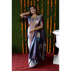 The Kanchipuram Pure Silk Handloom Saree with Silver and Gold Jari is a timeless piece of exquisite craftsmanship, synonymous with luxury and tradition. Originating from the ancient town of Kanchipuram in Tamil Nadu, this saree is a testament to the rich cultural heritage and unmatched weaving skills passed down through generations. The saree is meticulously crafted from pure mulberry silk, renowned for its lustrous texture and durability. Each saree is handwoven on traditional looms, ensuring that every piece is unique and embodies the artistry of the weaver. The process involves intricate and labor-intensive techniques, making each saree a masterpiece. One of the most striking features of this saree is the use of silver and gold jari, or zari, which is a fine metallic thread woven into the fabric. The jari work adds a touch of opulence and grandeur to the saree, making it a perfect choice for weddings, festivals, and other special occasions. The combination of silver and gold jari creates a stunning contrast against the vibrant hues of the silk, enhancing the overall elegance of the saree. The pallu, or the end piece of the saree, is often adorned with elaborate designs, motifs, and patterns, which are inspired by nature, mythology, and traditional Indian art. These motifs can range from intricate paisleys and florals to depictions of temples and deities, each telling a story of its own. The body of the saree is equally captivating, with rich and bold colors that are achieved through natural dyes. The border of the saree, known as the petticoat, is usually embellished with detailed jari work, adding to the saree's regal appearance. Wearing a Kanchipuram Pure Silk Handloom Saree with Silver and Gold Jari is not just about adorning a piece of clothing; it is about embracing a legacy of tradition, art, and culture. It is a celebration of the skill and dedication of the artisans who pour their heart and soul into creating these beautiful works of art. Whether draped for a grand occasion or treasured as a family heirloom, this saree is a symbol of timeless beauty and elegance.