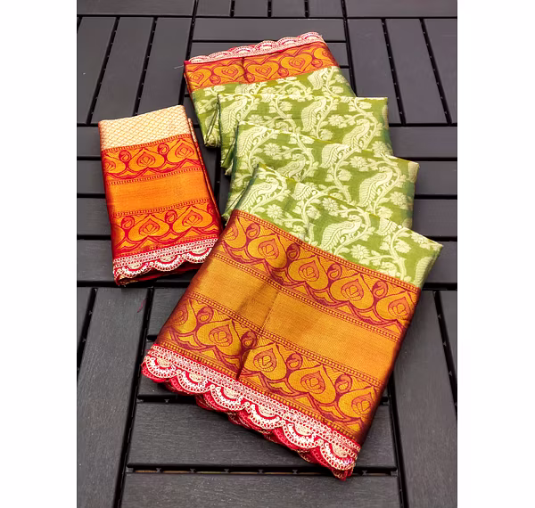 Introducing the Lace Morni BANARASI Saree - a masterpiece that exudes elegance and grace, perfect for any occasion. Made with high-quality Banarasi silk, this saree features a beautiful cut work embroidery lace border that adds a touch of sophistication to its overall design. With a length of 6.3 meters, it offers ample room to drape and style it to your liking, while the available colors (4 in total) provide versatility in choosing the perfect shade to match your style. This saree comes with a blouse piece that complements the overall design, allowing you to complete the look effortlessly. Its unique selling point lies in its versatility - it can be worn to a formal event, a family gathering, or even a wedding ceremony. The intricate lace border design adds a touch of modernity to this traditional Banarasi saree, making it a perfect choice for the modern woman. Crafted with utmost care and attention to detail, the Lace Morni BANARASI saree is a must-have for any saree lover. Its high-quality fabric, stunning design, and beautiful finish make it a timeless piece that you can cherish for years to come. With this saree, you'll be sure to turn heads and make a lasting impression. Order now and add this gorgeous saree to your collection today!