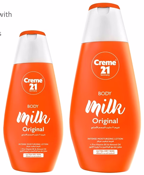 Creme 21 Body Milk avec huile d’amande naturelle et émollients nourrissants offre des soins protecteurs pour la peau ultra-sèche.