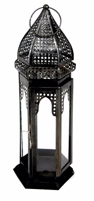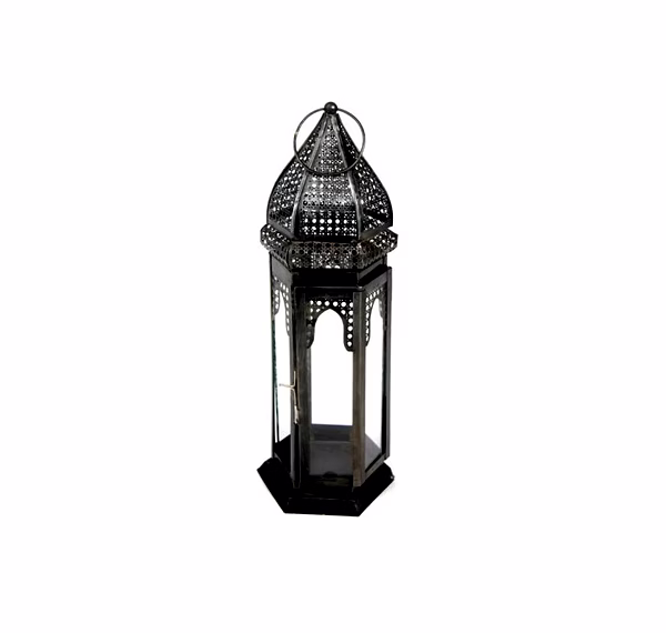 This lantern is made of iron and glass. It measures 5.75x5.75x15.25 inches and weighs 0.7 kg. It is a medium-sized lantern designed for decorative purposes.