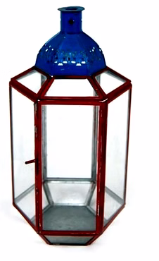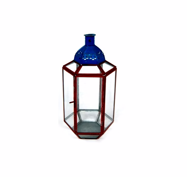 This lantern is made of iron and glass. It measures 6x5x10.75 inches and weighs 0.706 kg. It is a decorative lantern suitable for various settings.