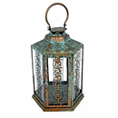 This lantern is made of iron and glass. It measures 11x11x16 inches and weighs 2.34 kg. It is a larger lantern suitable for creating an ambient atmosphere.