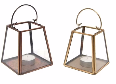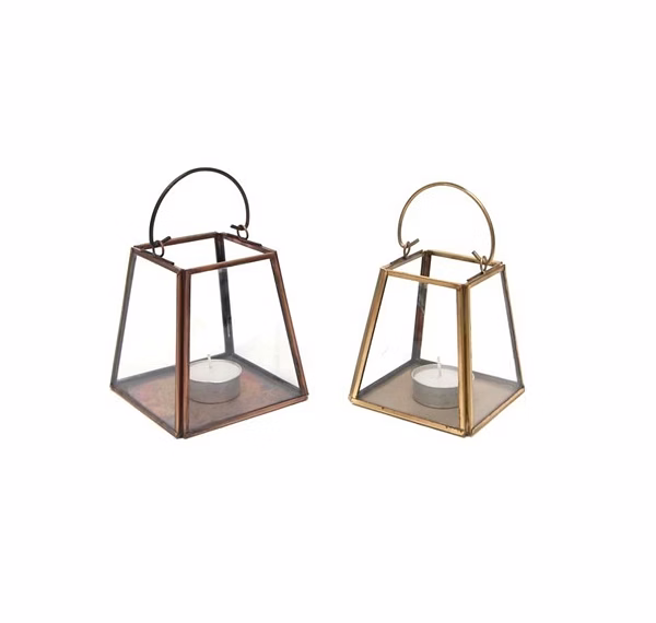This lantern is made of iron and glass. It measures 4x4x4.50 inches and weighs 0.278 kg. It is a small lantern suitable for tabletop or shelf decoration.