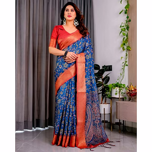 �Saree Fabric: Soft Linen Saree with Thread Work Style Silver Woven Border. Beautiful Embroidery Panel Work. Cotton Tassels on Pallu.