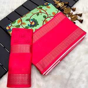 The Saree-On Box Dola Silk Pattern is a masterpiece of Indian craftsmanship that exudes elegance and sophistication. The saree is made from high-quality Dola Silk material, which provides a luxurious feel and offers exceptional comfort. The unique design of the saree features a stunning *5*2 jeq border that adds a touch of glamour to its overall appearance. The saree comes with an unstitched blouse made from Gold Box Dola Silk, which perfectly complements the saree's design and makes it a perfect fit for formal and casual occasions. The blouse features a matching border that blends seamlessly with the saree's overall design, giving it a complete and polished look. One of the unique selling points of this saree is that the saree border may change sometimes, which means that you will own a truly one-of-a-kind piece that is exclusive to you. This makes this saree a must-have for fashion-conscious women who are looking for a unique and stylish piece that sets them apart from others. In conclusion, the Saree-On Box Dola Silk Pattern is a beautiful and versatile saree that combines comfort, style, and elegance. Its high-quality material, unique design, and unmatched craftsmanship make it a perfect choice for women who want to look their best at all times. Whether you're attending a wedding, a party, or any other special occasion, this saree is sure to turn heads and make you the center of attention.