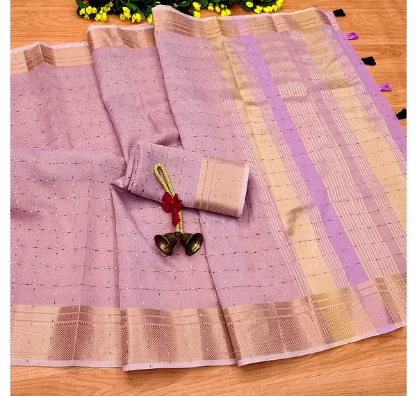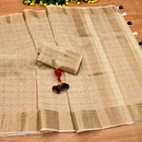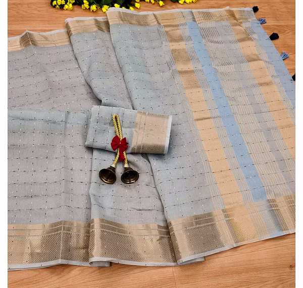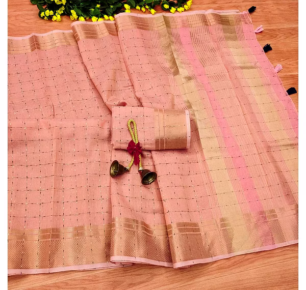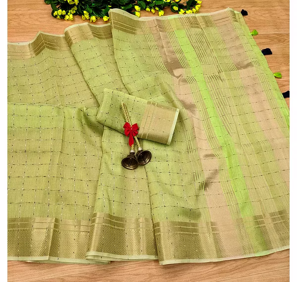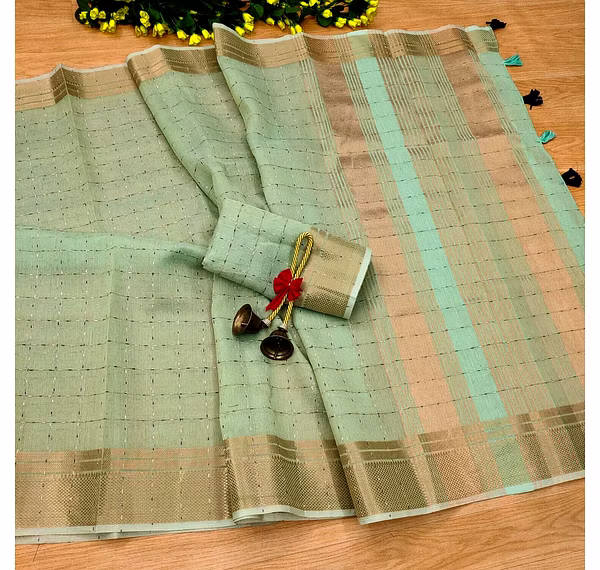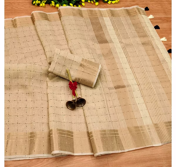 Introducing our exquisite Linen Art Silk Weaving Saree, a masterpiece of art and elegance. This saree is designed to captivate, with its intricate craftsmanship and luxurious details. Crafted with the finest linen and art silk, this saree exudes a sense of opulence and sophistication. The weaving technique used in creating this saree is truly remarkable, evident in the beautiful zari woven pallu that adds a touch of glamour and grandeur. The fulka tassels with zari detailing further enhance its allure, making it perfect for any special occasion. The saree features a striking zari woven border, adorned with resham and zari check weaving throughout the entire length. This intricate pattern adds depth and dimension to the saree, creating a stunning visual impact. The combination of traditional weaving techniques and contemporary design elements make this saree a true work of art. Not only is this saree a visual delight, but it also offers unparalleled comfort. The linen and art silk blend ensures a soft and smooth drape, allowing you to move with effortless grace. The lightweight fabric makes it ideal for all-day wear, ensuring that you look and feel your absolute best. Complete with a running blouse, this saree offers versatility and convenience. The blouse can be customized to suit your unique style, allowing you to create a truly personalized look. Elevate your style and make a statement with our Linen Art Silk Weaving Saree. With its impeccable design, luxurious details, and exceptional comfort, this saree promises to be a cherished addition to your wardrobe. Embrace the artistry and elegance of this timeless piece, and step into a world of unparalleled beauty.